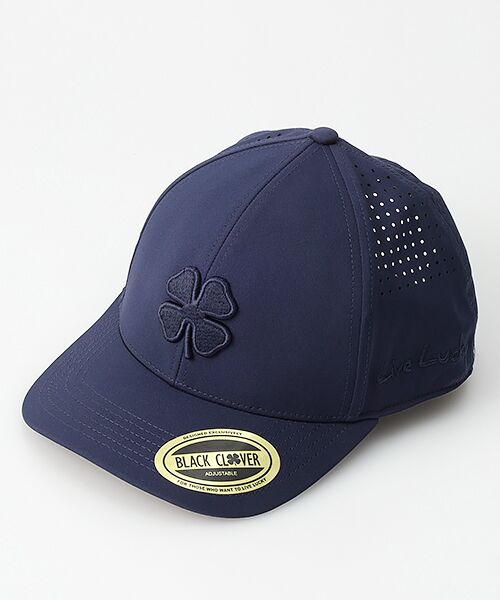 生地と同色のクローバーが立体的に刺繍されたシンプルデザインが特徴。調整可能なスナップバックに通気性の良いレーザーパンチの同色生地で機能にも優れています。