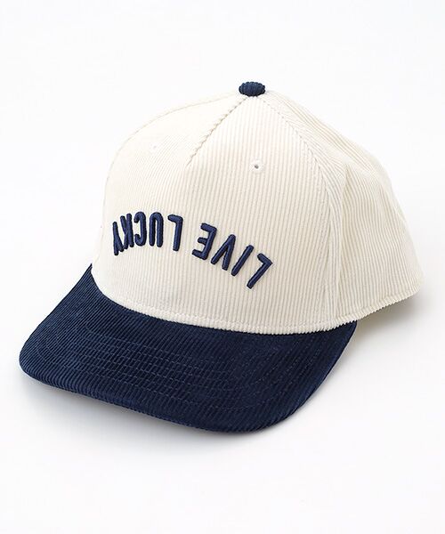 クラシックなコード素材に、クリームカラーのクラウンとネイビーのブリムを組み合わせた「CORD UPSIDE DOWN LUCK 3」。