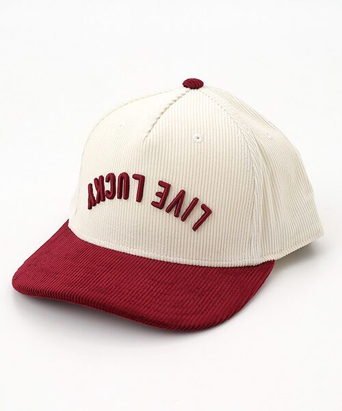 クラシックなコード素材に、クリームカラーのクラウンとレッドのブリムを組み合わせた「CORD UPSIDE DOWN LUCK 4」。