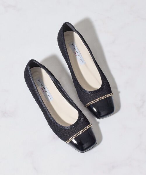 スクエアトゥの一文字切替に、華奢なチェーンをあしらったコンフォートパンプス。安定感のあるウェッジソールは歩きやすさも◎。少し透け感のあるチュールを本体に使い、締め付け感の少ないソフトな足当たりに仕上げています。