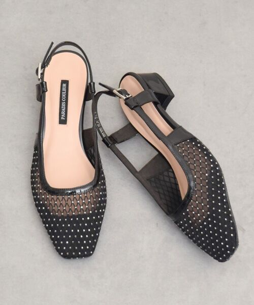 スクエアトウのバックバンドパンプスはラインストーン付きチュールの素材感が涼しげでエレガントな雰囲気です。安定感のあるローヒールのため一日中履いていても疲れづらく、デイリーに履いていただけるうれしい設計になっています。