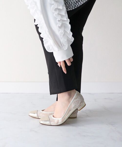 トゥ先をエナメル素材で締めアッパーには透け感のあるレース素材を使用し春らしい足元に。