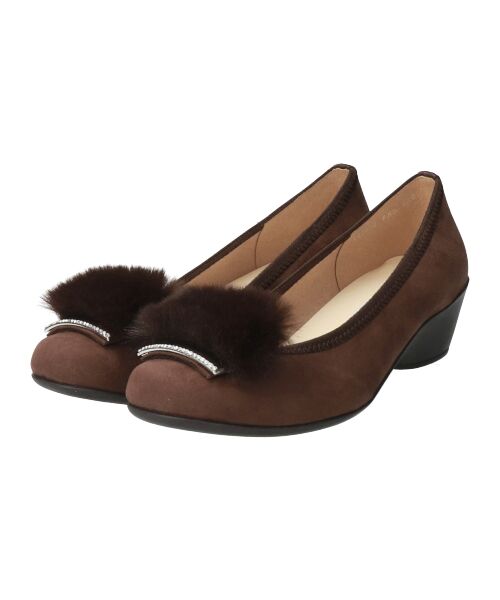 ふわふわのファーモチーフにキラキラビジューがアクセントの、マシュマロフィットのウォーキングパンプス。同系色合わせのファー使いが派手になり過ぎない可愛さに。機能と遊び心を兼ね備えたデザインです。つま先に消臭機能もついている万能なウォーキングパンプスです。