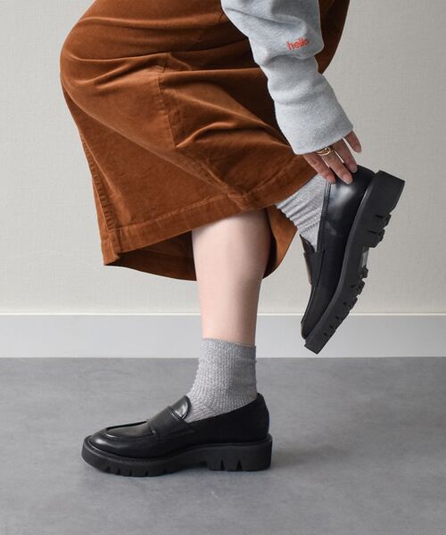 【ROUND ABOUT/ラウンドアバウト】ボリューム感があるのに軽くて返りの良いタンクソールを使ったマニッシュローファー。ソフトガラス調のマットな風合いの素材が、ベーシック過ぎないモードな表情になっていて、ソックス合わせやタイツ合わせにもおすすめです。突然の雨にも安心な晴雨兼用の作りになっています。※縫い目の裏側に防水テープを施していますが、完全防水ではありません。