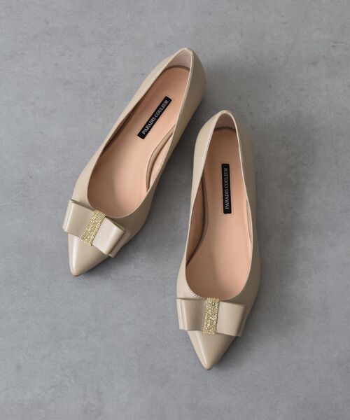 【PARADIS COULEUR/パラディクルール】キラリと光るボールチェーンのディティールがフェミニンな雰囲気のリボンフラットパンプスが「パラディクルール」から登場しました。安定感のあるローヒールのため一日中履いていても疲れづらく、デイリーに履いていただけるうれしい設計になっています。レディライクに合わせられる一足です。