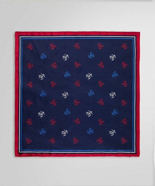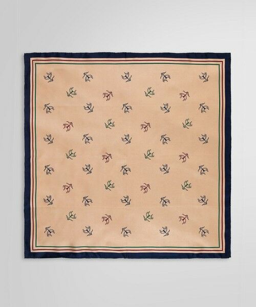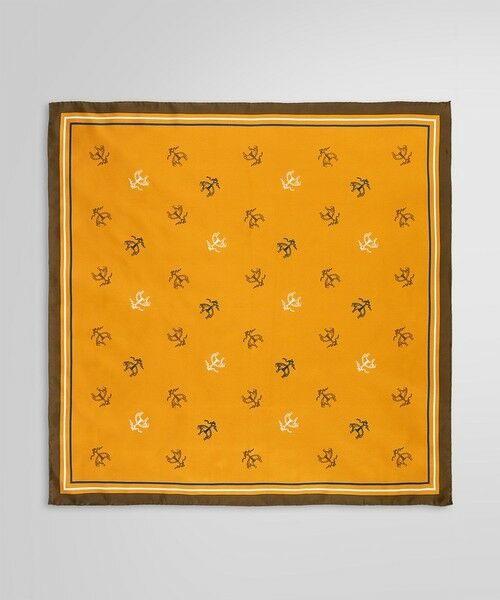 日本製のシルクスカーフ滑らかな肌触りと光沢感が魅力のシルク100%の生地を使用し、日本で縫製いたしました。カラフルなGF(ゴールデン フリース)マークを全面にプリントしました。コーディネートのアクセントとして活躍します。四辺は手巻きで処理されており柔らかく仕上げました。