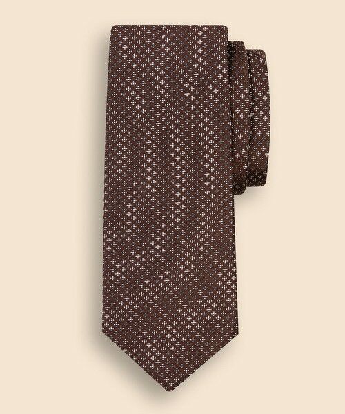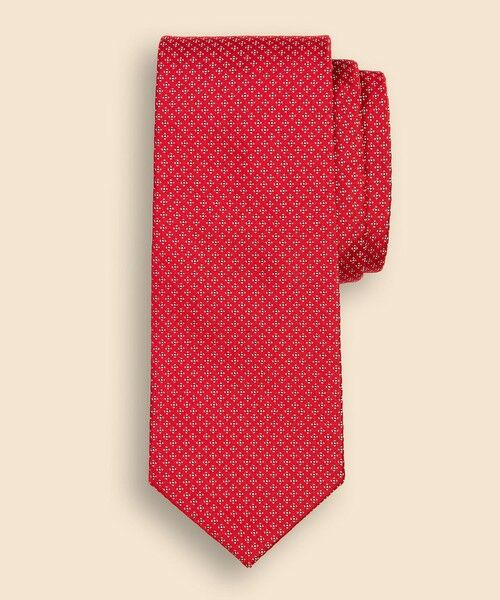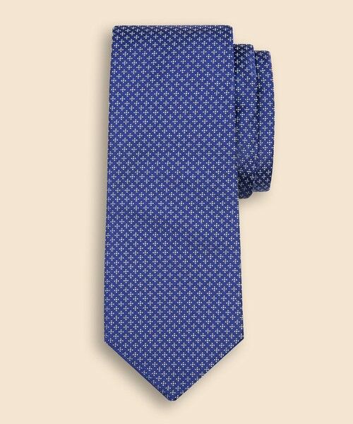 艶のある生地表面に、緻密且つ規則的な織り模様が浮かび上がり、奥行きが感じられるオールオーバーのタイです。無地感覚で使えるコーディネートのしやすさと、上品な華やかさが魅力。ビジネスシーンから休日のジャケットスタイルまで、幅広く着用可能です。