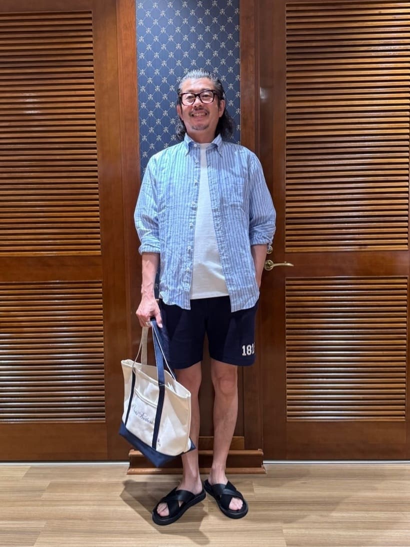 ブルーのリネンストライプシャツをコーディネートしました。 インナーにコットンジャージーTシャツ、ボトムスはネイビーのショートパンツで合わせました。 リネンストライプシャツは爽やかな印象を与え、軽やかな一着です。 コットンジャージーTシャツは、肌触りが良く、耐久性も抜群。 カジュアルなシーンからアクティブな日常まで、幅広く活躍します。 パイル地のショートパンツは快適な着心地がこれからのシーズンにお勧めです。 また、トートバッグは、Made in USAの特別な一品。 日常使いやお出かけにぴったりで、スタイリッシュに持ち運べます。 スタッフ身長:175cm シャツ着用サイズ:S Tシャツ着用サイズ:M パンツ着用サイズ:M ※掲載商品以外は私物です