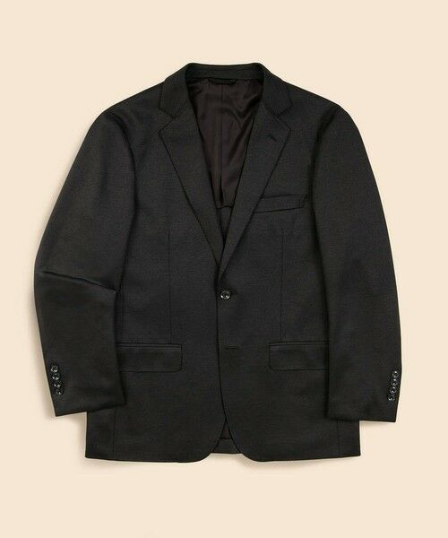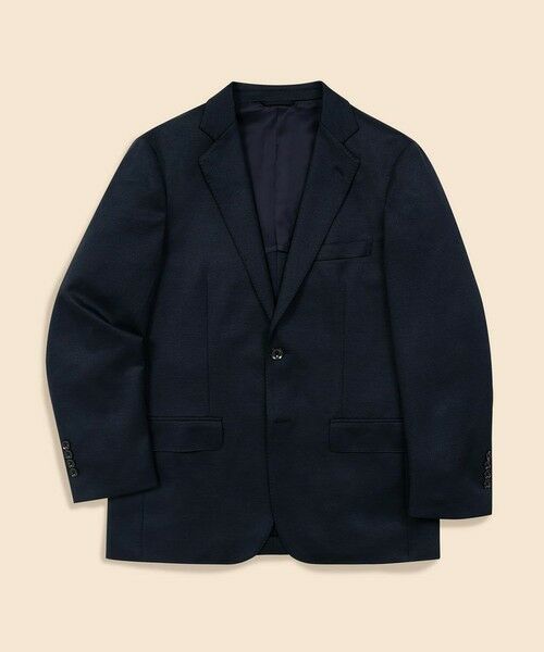 ハリ感のあるニットジャージーを用いて快適な着心地と端正な表情を両立させたピンドット柄シングル2釦ジャケット
