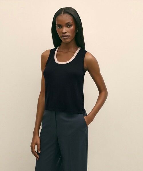 ネックラインに施された淡いカラーのトリミングを施しシンプルなノースリーブセーターに施された、淡いカラーのネックライントリミングが、控えめなデザインに魅力を添えています。シルク混糸を使用して編み上げ、美しいドレープと繊細な光沢感、滑らかな手触りを実現。ワイドレッグパンツやデニムスカートなど、少し辛口なアイテムとのコーディネートも素敵です。■同生地のカーディガン(品番:P25630100228670)と合わせて、アンサンブルとしてもお召しいただけます。
