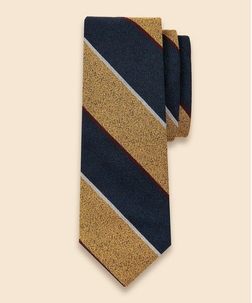 眺めているだけで秋冬の着こなしが次々と頭に浮かぶような、魅力的な配色のストライプタイです。休日のジャケットスタイルから、ビジネスシーンまで幅広くお使いいただけます。ツイード、フランネル、コーデュロイといった起毛感のあるジャケットと相性が良く、Vゾーンに季節感をプラスします。ネイビーブレザーとも相性の良い一本です。イタリアのテキスタイルメーカー、Classico Seta社の生地を使用し、日本国内で丁寧に縫製しました。