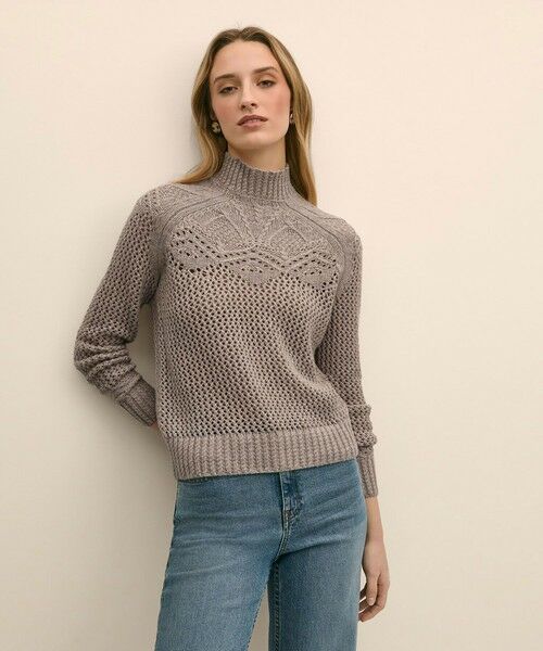 軽くて柔らかなウール糸で編まれたポインテールモックネックセーターレース編みのような装飾的な透かし模様が、上品な甘さを醸し出します。ジャケットのインナーにしていただいたり、フェミニンなスカートスタイルでロマンチックにお召しいただくのはもちろんのこと、デニムパンツやワイドパンツを合わせてメンズライクな要素とのコントラストを効かせたコーディネートもお薦めです。■ヨーク下からボディにかけて透け感があるデザインです。別売りのコットン スクエアラウンドネック タンクトップ(品番:100217354)などインナーを合わせてご利用いただくことをおすすめします。