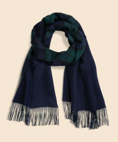 異なる表情を見せるダブルフェイスカシミヤマフラーカシミヤは上品な光沢があり、軽くて柔らか、それでいて保温性にも優れ、何よりも肌触りの良さが特徴です。表裏にブラックウォッチ柄と単色のネイビーを配したダブルフェイス仕様。巻き方によって二つの色の見え方に変化が生まれ、幅広いコーディネートで活躍します。トレンドに左右されることなく、年齢性別を問わずお使いいただける上質なマフラーは、ギフトにもお薦めです。