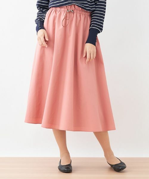 ジャストフィットで穿けるシンプルな無地デザインのフレアスカート。ドロストコードがトップスインで着こなした時のアクセントになり、きれいめスタイルのハズしとして引き立ちます。