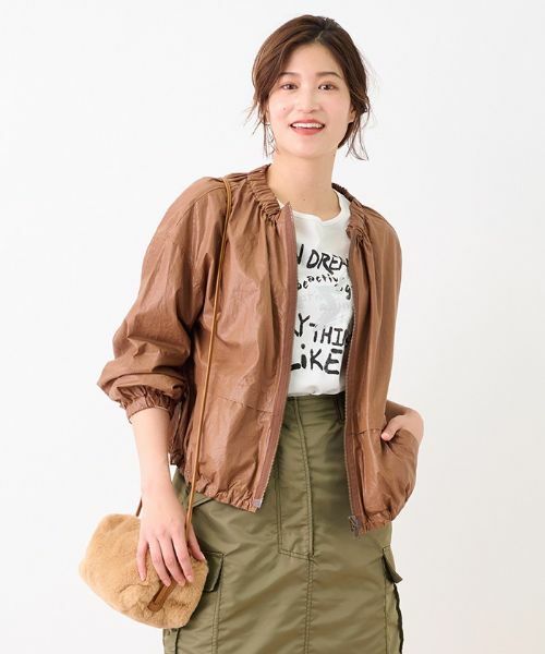 光沢とシャリ感のあるテキスタイルを使用した、アクティブな雰囲気溢れるジップアップブルゾン。ネックラインや袖口、ヘムのギャザーが豊かな表情を演出します。カジュアルなコーディネートにはもちろん、あえてキレイめなスタイリングにプラスしてMIX感のある着こなしを楽しんでも◎。