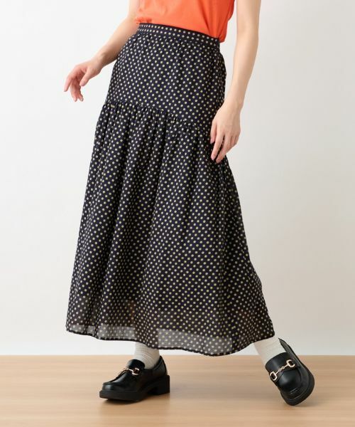 細やかなドット柄がちょっぴりクラシカルなムードをいざなうロングスカート。ラウンドした切り替えにたっぷりギャザーを施し、ふっくらとキュートなシルエットをメイク。足元はヒールパンプスでレディに、スポーティーなスニーカーでカジュアルにと、多彩なスタイルに取り入れられるのでコーディネート力もバッチリ。ウエストに伸縮性をもたせているので穿き心地も快適です。サイドファスナーあり。