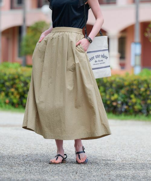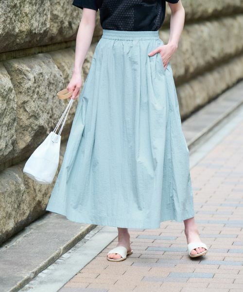 独自のテクスチャーを持つ爽やかな風合いの生地を使用した、ロング丈のフレアスカート。生地には撥水加工が施されているため、天候が変わりやすいこれからの季節にも安心。ほんのりフェミニンなムードを漂わせるフレアシルエットで、さらりと羽織るだけでこなれ感のある着こなしが楽しめます。ウエストは総ゴム仕様で心地よいフィット感をもたせました。シンプルな無地で合わせやすく、カットソーやブラウスなどをタックインすれば、脚長見せのスタイルアップ効果も狙えそうです。