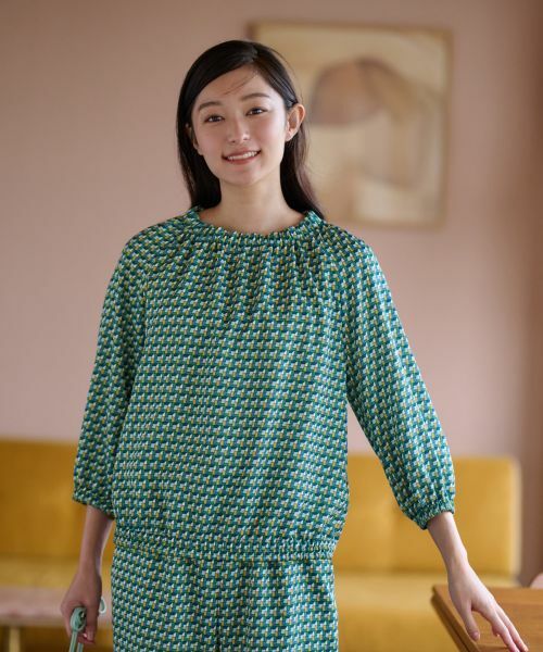 モダンなジオメトリックプリントが個性を引き立てる、クロップドスリーブのブラウス。やや薄手の爽やかな風合いの生地を使用し、快適な着心地を実現しています。ネックや袖口、ヘムにはゴムを通して心地よいフィット感をもたせ、ふんわりとしたフェミニンなシルエットを構築しています。季節の変わり目の様々なシーンで、大人の女性らしい洒脱な上品さを演出。一枚でのスタイリングはもちろん、プレーンなジャケットやカーディガンのインナーとしても活躍してくれるトップスです。バックファスナーにより開閉が可能。