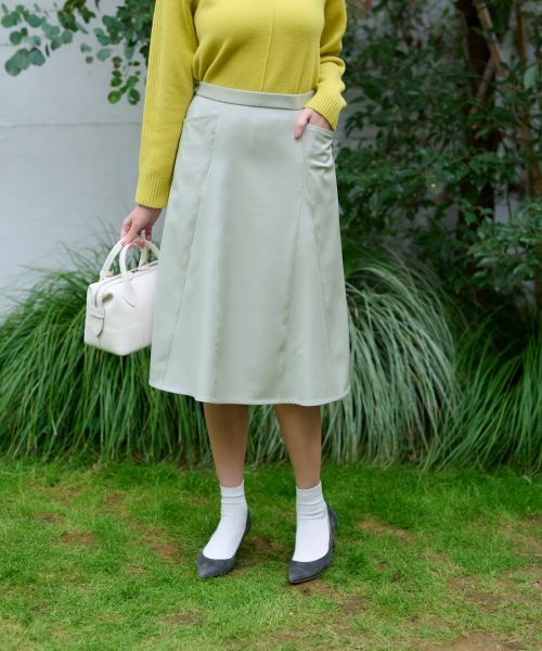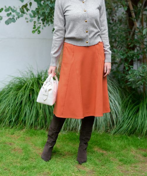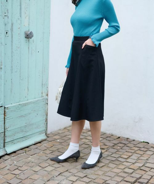 膝丈程度の上品なAラインシルエットでデザインした、クラシカルモダンなフレアスカート。しっかりとした質感の生地には伸縮性があり、肌当たりもよくこれからの季節にぴったり。バックウエストはゴム仕様で心地よくフィットします。両サイドには実用的なポケットをレイアウト。デイリーからオフィス、お呼ばれまで多彩なシーンで活躍してくれそうなアイテムです。バックのホック&ファスナーによりスムーズに着脱が可能。セットアップ対応。