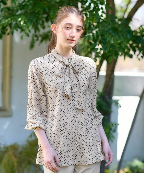 シンプルながらも存在感のあるドット柄をちりばめた、前ボタン留めのボウタイブラウス。クラシックな雰囲気を漂わせながらも、ふわりと揺れるボウタイが華やかかつエレガントなアクセントに。袖や後ろ身頃にはギャザーを施し、柔らかなドレープ感を演出。シンプルなパンツを合わせてシックにまとめれば、洗練された大人の装いが完成。フレアスカートやプリーツスカートと合わせれば、フェミニンで愛らしいスタイリングに仕上がります。------------------------------------着用シーズン:春伸縮性:なし透け感:ありポケット:なし生地の厚さ:薄手お取扱い方法:ウォッシャブル(手洗い可)付属品:リボン取り外し可-------------------------------------※商品の色味は、撮影場所や光のあたり具合、お客様のお使いの機器により色味が違って見える場合がございます。予めご了承ください。手洗い可酸素系漂白可タンブル乾燥不可つり干し(日陰)アイロン低温120℃までドライクリーニング可ウェットクリーニング(弱い処理)