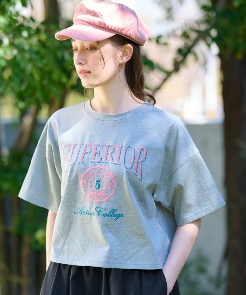 「SUPERIOR」のロゴとカレッジ風のエンブレムデザインに目を惹くカットソー。カジュアルでスポーティーな雰囲気を持ちつつ、刺繍やプリントのディテールがアクセントになっています。やや短めの丈感で、ハイウエストのボトムスやスカートと合わせやすく、トレンド感のあるスタイルを楽しめます。スウェットパンツと合わせたラフなコーディネートはもちろん、カーディガンを羽織ってレイヤードスタイルにも。ジャケットのインナーに合せるなど活躍するアイテムです。