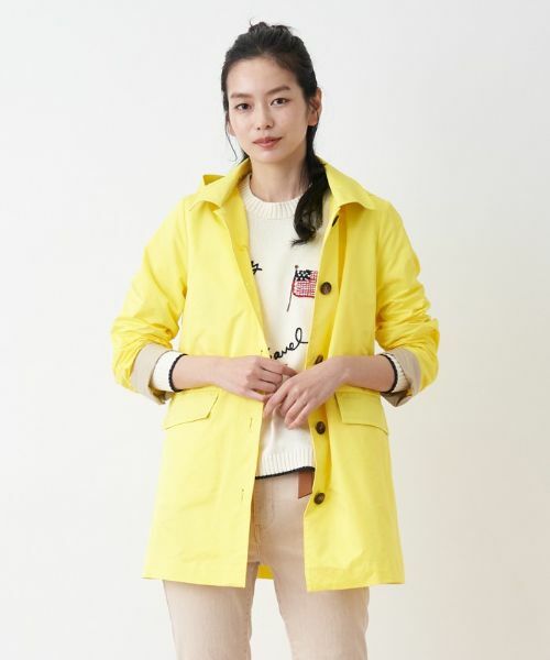 ハリのあるテキスタイルで仕立てた、清潔感のあるショート丈のステンカラーコート。大きめのフードでカジュアルな雰囲気を取り入れているから、気負うことなくスタイリングできます。フロントには表情のあるマーブルボタンを採用しています。爽やかなカラーリングが季節の訪れを感じさせる、端境期にオススメのアウターです。フードは取り外しが可能。