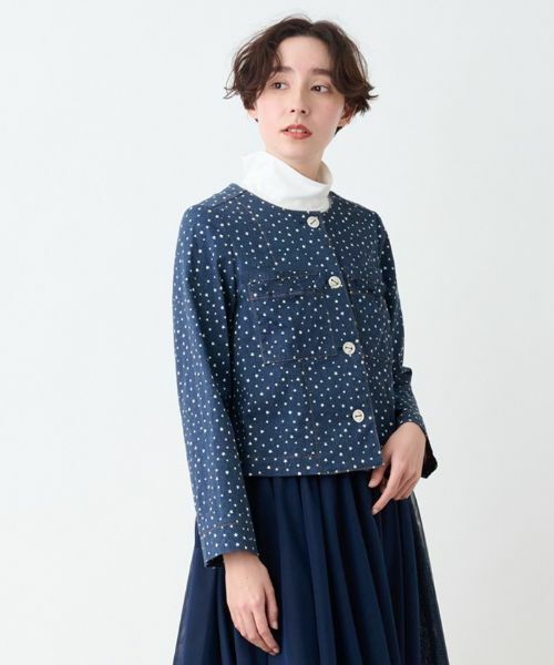 手描きタッチの小さな星柄を散りばめた、デニム風のノーカラージャケット。アンカーマークをデザインした大きめのフロントボタンや、裏側のに施したカラーパイピングなど可愛らしいアクセントに。両胸にはシンプルなポケットをバランスよくレイアウトしています。デニムやワイドパンツを合わせたカジュアルスタイルはもちろん、エアリーなロングスカートでフェミニンにまとめてみるのも素敵です。