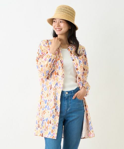 色鮮やかなジオメトリックプリントが周囲の視線をキャッチする、春夏らしさたっぷりのチュニックブラウス。ふんわり膨らむボリュームスリーブで仕上げており、袖口はゴム仕様で心地よくフィット。裾に向かってフレアに広がるシルエットが季節らしい軽やかなニュアンスを感じさせる一枚。主役級のインパクトのあるトップスはシンプルなボトムスでまとめるだけで、旬度の高いスタイリングが完成します。