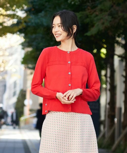 さりげなく編み地に変化をもたせた、独特な表情のある長袖ニットカーディガン。左ショルダー下のモチーフや裾サイドにあしらった開閉可能なボタンなど、ディテールにもこだわりが感じられるアイテムです。裾ボタンを開けるとトリコロールテープが見えるのもポイント。すっきりとした短めの丈感でボトムスともコーディネートしやすく着回し力抜群です。フロントボタンを開けてちょっとした羽織りとしても使えるから、1枚あるだけで幅広く活躍してくれるそうです。