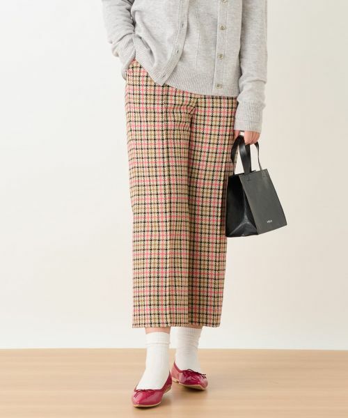 やや薄手のストレッチ性に優れた生地を使用した、ガンクラブチェックのクロップドパンツ。明るい色使いのトラッドなチェックが目を惹き、秋冬のコーディネートの主役になってくれるアイテムです。裏地にも伸縮性があり、バックウエストはゴム仕様で心地よくフィットします。シンプルなニットやカットソーはもちろん、フェミニンなブラウスとの相性もよく、ひと味違った洒脱感溢れるスタイリングが楽しめます。同デザインのジャケットとセットアップで着こなすのもオススメです。