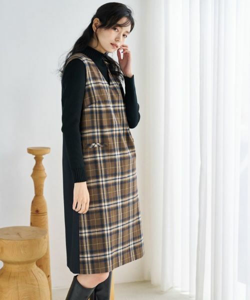 フロントをトラディショナルなチェック柄、バックをシンプルな無地で仕上げた切り替えデザインのジャンパースカート。前後で雰囲気がガラリと変わる、メリハリたっぷりのアイテムです。シャープなVネックが顔周りに抜け感を与え、お手持ちのカットソーやニットとのレイヤードルックもお洒落に決まります。膝上丈の緩やかなAラインシルエットで軽やかさもプラスしました。バックファスナーにより開閉が可能です。