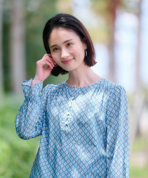 民族的なエッセンスを漂わせるユニークな幾何学柄が彩る、さらりとした風合いの薄手の生地で仕立てたブラウス。ふわりと広がりをもたせたキャンディスリーブの袖口はゴム仕様で心地よくフィット。フレアなロングスカートで大人ガーリーに着こなすのはもちろん、プレーンなデニムパンツを合わせてカジュアルにまとめるのも素敵です。