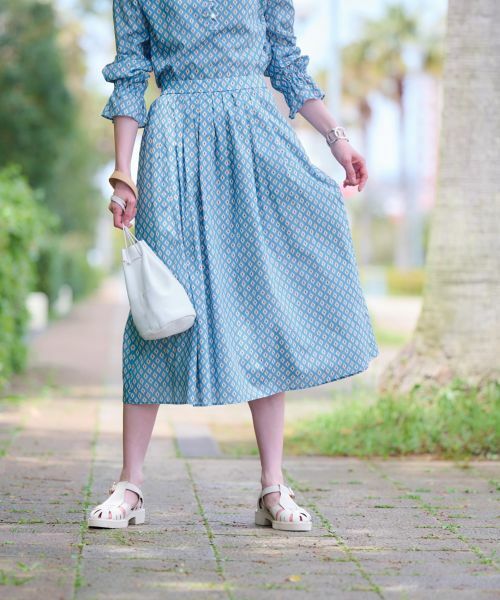 民族的なエッセンスを漂わせるユニークな幾何学柄を散りばめたミモレ丈スカート。ウエストタックからふわりと広がる美しいシルエットがフェミニンなムードを演出。バックウエストはゴム仕様とし、程よいフィット感をもたせました。薄手のさらりとした生地の風合いが心地よいアイテムは、これからの季節のコーディネートにぴったり。優しい質感のニットで大人ガーリーに着こなすのはもちろん、プレーンなシャツを合わせてカジュアルにまとめるのも素敵です。