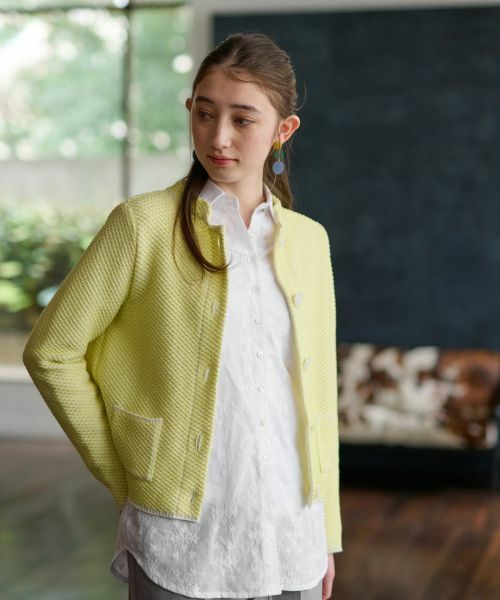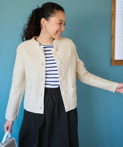 ジャケットのようなきちんと感をキープしたふんわりニットの長袖カーディガンは、よそ行きシーンやオフィスにも活躍。立体感のあるスタンドカラーが顔周りをきりっと引き締めます。ツイードライクな仕上がりでレディに決まる一品。------------------------------------着用シーズン:春伸縮性:あり透け感:ありポケット:あり生地の厚さ:やや薄手裏地:なし-------------------------------------※商品の色味は、撮影場所や光のあたり具合、お客様のお使いの機器により色味が違って見える場合がございます。予めご了承ください。家庭洗濯不可漂白不可タンブル乾燥不可アイロン低温160℃までドライクリーニング可ウェットクリーニング不可