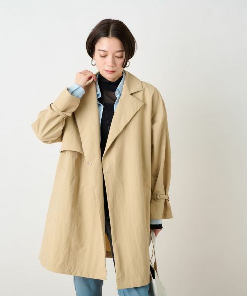 メンズライクな佇まいに仕上がる、オーバーシルエットのスプリングコート。はっ水加工を施したさらりとした風合いの生地で、少々の雨でも気にせずに着用できます。ガンフラップや袖口のバックルベルトなど、さりげないディテールへのこだわりがデザインに差をつけるポイント。ベーシックな無地で合わせやすく、インナーとのレイヤードを楽しむのもおすすめです。機能性とファッション性を兼ね備えたアウターは、これからの季節のお出かけスタイルを格上げしてくれること間違いなし。