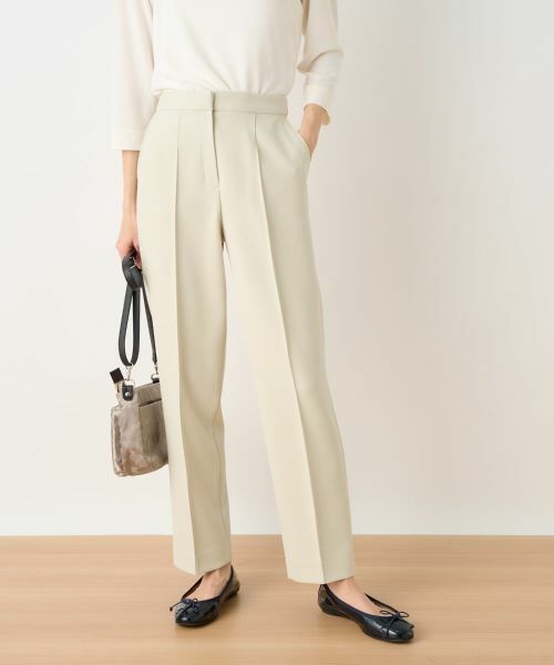 センターシームがきちんと感を演出してくれる綺麗なテーパードシルエットを描くパンツ。レーヨンをブレンドした肌当たりのよい生地には程よくストレッチが効いているので足捌きも良好。ウエストには伸縮性があり心地よくフィットします。無駄な装飾を省いたシンプルなデザインでコーディネートを品よくすっきりとまとめてくれる一本です。オンオフのシーンを選ばずに対応できるので汎用性も抜群。