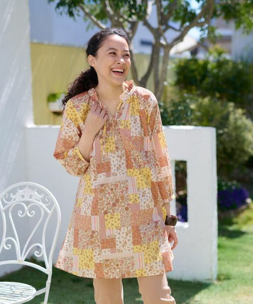 フラワーモチーフのパッチワーク柄がノスタルジックな魅力を感じさせる、カントリーテイストのチュニックブラウス。統一感のある色合いで派手になりすぎることなく、上品な可愛らしさを際立たせます。襟元のリボンを結べばほんのり甘いエッセンスに。シンプルなデザインのパンツでまとめるだけでもひと味違った着こなしが完成する、注目度の高いアイテムです。