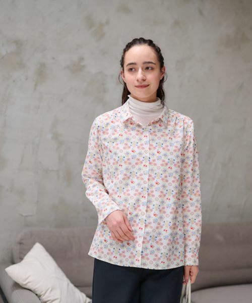 どこか懐かしさを感じさせる、可憐で温かみのあるフラワープリントが魅力のショートカラー長袖シャツ。端正なフォルムのすっきりとした襟元が、顔周りを美しく引き立て、大人の女性らしいムードを演出。袖と身頃にはふわりとしたゆとりをもたせ、適度なリラックス感とトレンドライクなシルエットをメイク。スキニーパンツやワイドパンツはもちろん、ミモレスカートとのコーディネートにもぴったりの一枚です。