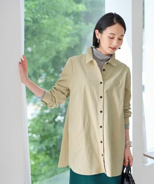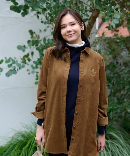 細畝のコーデュロイ素材を使用したチュニックシャツ。第一ボタンを開けて着こなすと、首元がすっきりとした印象になりおすすめです。左胸にはスパンコールのが煌めくエンブレム刺繍がさりげなく施され、シンプルな中にも個性を感じさせるアクセントに。前ウエストの左右に小ぶりなポケットをレイアウトした、実用性とデザイン性を兼ね備えた一枚。スポーティなパンツはもちろん、フェミニンなスカートを合わせたスタイリングまで幅広く活躍します。