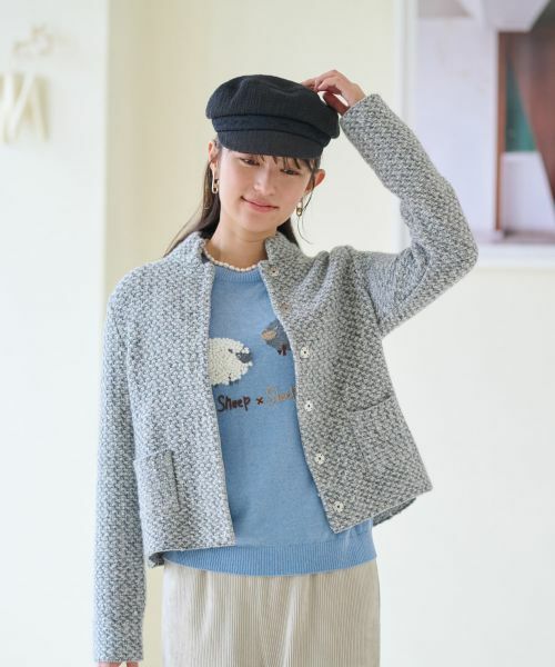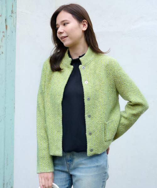 ざっくりとした織りが温もりを感じさせるニットジャケット。ショート丈が可愛らしさを引き立てつつ、スマートなスタンドカラーで甘さを抑えた絶妙なバランスを演出。スカートやワンピースに合わせてもフェミニンになりすぎず、上品で洗練された印象に。フロントはスナップボタンにより開閉が可能。きちんと感のあるボトムスとコーディネートするのはもちろん、デニムやチノパンなどカジュアルなアイテムとも好相性。様々なスタイルで楽しめる、これからの季節のワードローブに加えたい一着です。