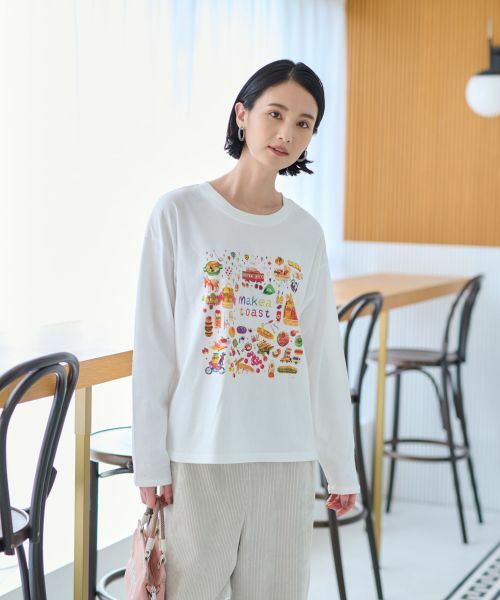 華やかでユニークなプリントがひと目で視線を惹きつける、存在感たっぷりのTシャツ。イラストレーター【イワタニユウスケ】さんとのコラボレーション企画で誕生した注目のアイテムです。パンやフルーツ、そして愛らしい動物たちがほっこりとしたタッチで描かれており、見ているだけで心が温まるデザインです。肌当たりのよいコットン生地を使用しており、ややゆとりのあるリラックスシルエットでラフに着こなせるのもポイント。デイリー使いはもちろん、ちょっとしたお出かけにも映える一枚です。