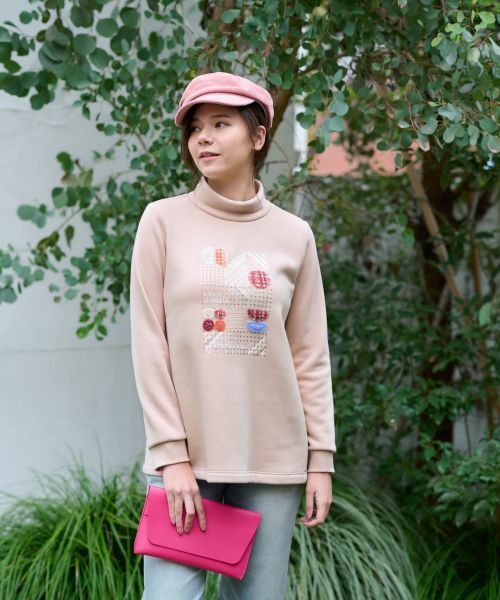 フロント部分にあしらわれた幾何学模様とボタン風の装飾が目を惹く、シンプルながら個性が光るハイネックトップス。巧妙にスパンコールやビーズを取り入れ、さりげない存在感をプラス。柔らかく暖かみのある生地感が、これからの肌寒い秋冬シーズンにふさわしい快適な着心地を実現します。ゆったりとしたシルエットで程よいリラックス感を演出し、カジュアルからキレイめまで幅広いコーディネートに対応できる一枚です。------------------------------------着用シーズン:秋伸縮性:あり透け感:なしポケット:なし生地の厚さ:やや厚手お取扱い方法: ウォッシャブル(手洗い可)-------------------------------------※商品の色味は、撮影場所や光のあたり具合、お客様のお使いの機器により色味が違って見える場合がございます。予めご了承ください。手洗い可漂白不可タンブル乾燥不可つり干し(日陰)アイロン低温120℃までドライクリーニング不可ウェットクリーニング(弱い処理)