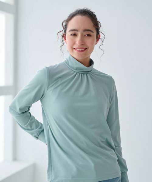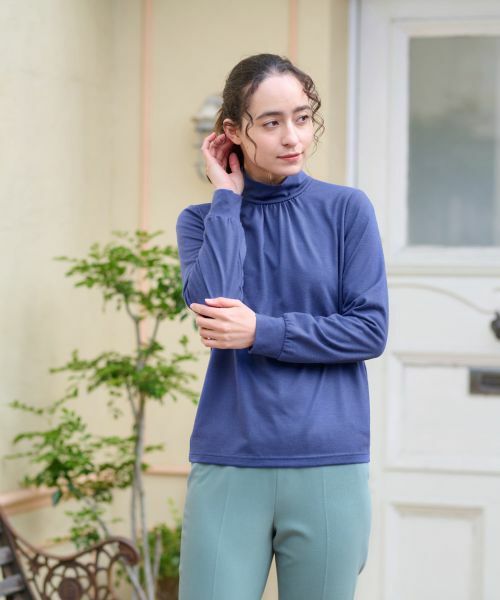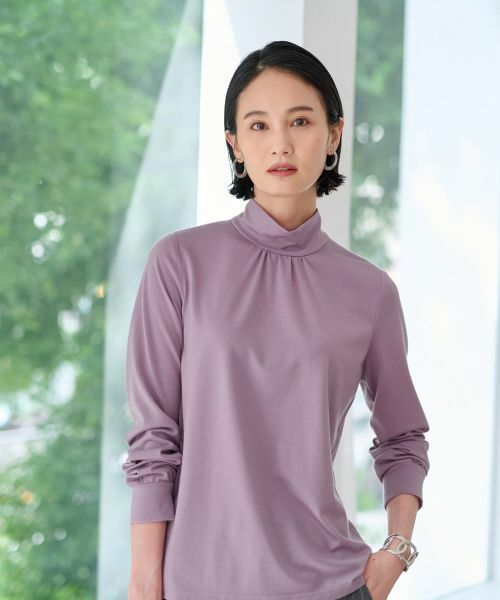 上品かつ柔らかな色合いのタートルネックカットソー。首元に施された繊細なギャザーが女性らしい優雅なシルエットを引き立て、リラックス感とエレガントさを絶妙に両立。薄手で軽やかな素材感は肌触りがよく、快適に着られるのもポイント。ジャケットやカーディガンのインナーとして重ねてもごわつかず、すっきりとした着こなしが楽しめます。また、ネックレスやピアスなどのアクセサリーをプラスすることで、より洗練されたスタイリングに仕上げられるアイテムです。バックファスナーにより着脱が可能。