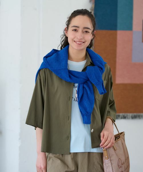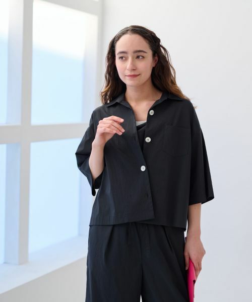 撥水性のあるナイロンベースの生地を使用したシャツ感覚で羽織れるライトジャケット。ほんのりシワ感を含んだ表面がニュアンスを生み、カジュアルさの中にも品のある佇まいを叶えます。ワイドに開いた襟元が顔まわりに抜け感をプラスし、Tシャツの上にさらりと重ねるだけで大人のレイヤードスタイルが完成。ドロップショルダーとゆとりのあるボックスシルエットが、リラックスした着心地を実現します。左胸に添えられたミニマルなポケットが、デザインのアクセントに。セットアップ感覚で同素材のワイドパンツと合わせても、ふんわりスカートで女性らしさを添えても好バランス。