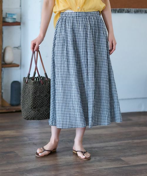 クラシカルな愛らしさと爽やかさを兼ね備えた、ギンガムチェックのミモレ丈スカート。コットンにリネンをブレンドした清涼感のある生地は、ほんのりとしたシャリ感と通気性に優れ、春夏の装いにぴったりの素材感です。裾に向かってやさしく広がるフレアラインが、歩くたびに揺れて軽やかな女性らしさを演出。ウエストは総ゴム仕様で、見た目の美しさと着心地の良さを両立しました。シンプルなトップスと合わせるだけで、ナチュラルなフェミニンなスタイルが完成します。