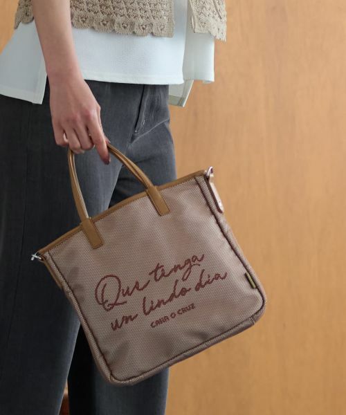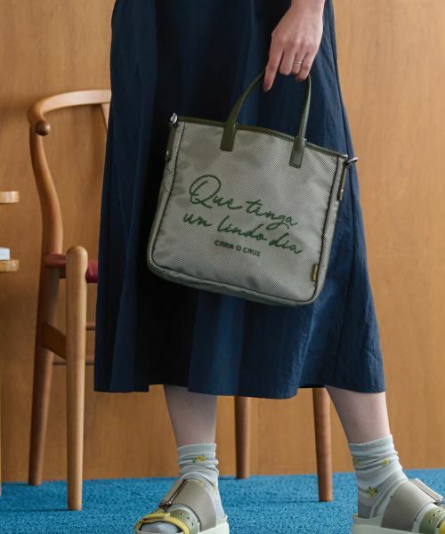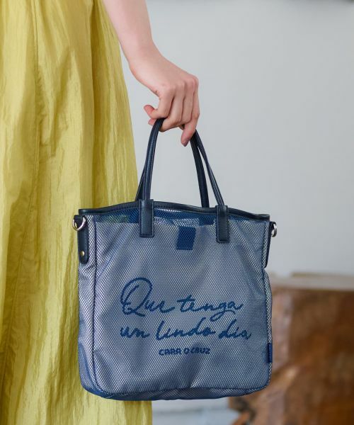 カジュアルな日常に心地よく寄り添う、軽やかなメッシュ調素材のミニトート。フロントに筆記体ロゴのスペイン語で 「Que tenga un lindo dia(すてきな一日を過ごしてね)」のメッセージをオン。柔らかなニュアンスと前向きな気持ちをさりげなく添えます。マグネット開閉の気軽さと機能的なポケット配置で使い勝手もスマート。取り外し可能なショルダーストラップ付きで、手持ちと肩がけの2WAYスタイルを楽しめます。