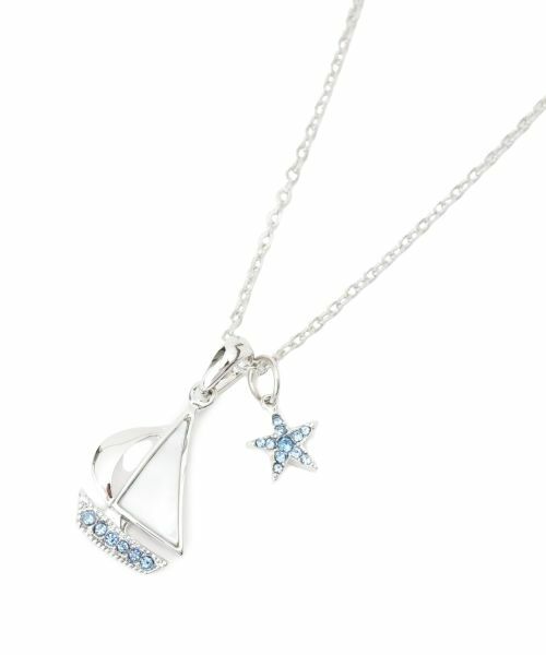 爽やかなラインストーンの輝きをまとったヨットモチーフが目を惹くペンダントネックレス。その横には小さなスターを添えてポップで遊び心のあるアクセントをプラス。スポーティやカジュアルなスタイルにはもちろん、シンプルになりがちなコーディネートにさりげない個性を添えるワンポイントにもおすすめです。タウンからリゾートまで多彩なスタイルにマッチする、季節感を楽しめるアクセサリーです。