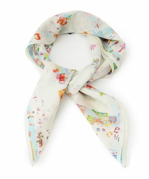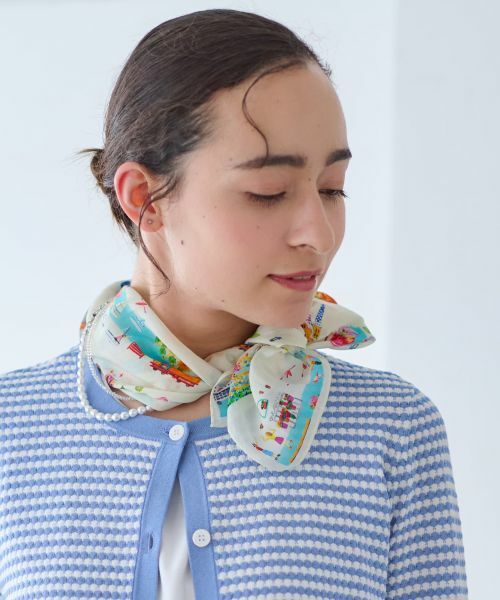 どこか懐かしくて温かい、水彩タッチのレトロな風景柄が広がるスカーフ。イラストレーター・イワタニユウスケ氏による街並みや人々の穏やかな日常を描いたような優しいイラストが、装いに物語を添えてくれます。コットンにシルクをブレンドした軽やかな生地は、ふんわりとした肌触りで春夏の首元に心地よくフィット。端はミシン巻きで丁寧に仕上げ、ナチュラルな表情に。バッグに結んでも、気負わず取り入れられるちょうどいい存在感で、毎日のスタイルにちょっとした彩りを添えるアイテムです。
