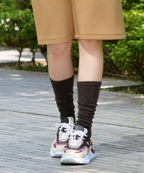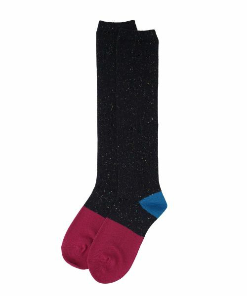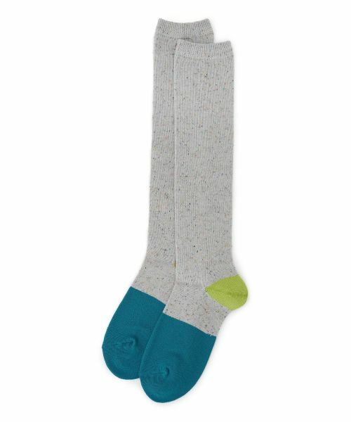 つま先とかかとの鮮やかな配色切り替えがポイント。靴を脱いだ時に遊び心をアピール出来るカラフルなネップ入りのハイソックス。旅先でのシンプルなスタイリングもこれ一足で個性的にアップデートでき、コーディネートのポイントにぴったりです。