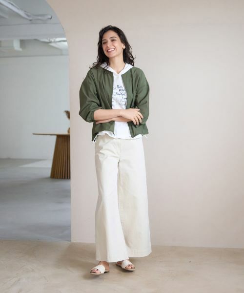 ストレッチの効いた素材で快適な着心地を叶える、ジップアップジャケット。フロントはファスナー開閉、裾にはドローコード付きで気分に合わせてシルエットの調整も自在。ややゆとりのある身頃とギャザーを寄せたバックデザインが抜け感のある立ち姿を演出します。シンプルながらも、細部までセンスが光るライトアウターとなっており、オンにもオフにもなじみ日常を軽やかに彩ります。